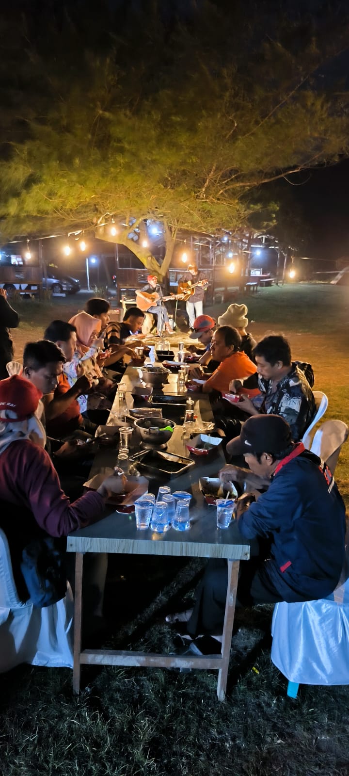 Event ini merupakan inisiatif kreatif dari Nuansa Event Network dalam rangka memperingati Hari Ulang Tahun ke-80 TNI Angkatan Laut. suasana gala dinner hari Sabtu ( 6/9/2025) terasa lebih dari sekadar jamuan. Ini adalah sebuah perayaan akbar yang menyatukan setiap jiwa yang hadir. Tenda-tenda camping yang berdiri anggun di hamparan rumput hijau, menjadi tempat peristirahatan bagi para penikmat alam yang memilih menghabiskan malam di bawah langit Jember yang bertabur bintang. Mereka bukan hanya peserta, tetapi bagian integral dari kehangatan yang tercipta. Di sebuah meja panjang, hidangan seafood gabrukan yang lezat disajikan, memancarkan aroma gurih yang menggugah selera. Di sana, di bawah sorotan lampu temaram, tawa dan obrolan mengalir bebas, meluruhkan sekat antara kawan dan lawan.
