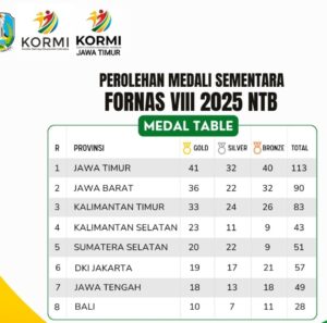 Berikut up date terbaru 5 besar perolehan medali sementara Fornas VIII NTB 2025 pukul 08.00 Wib tanggal 29 Juli 2025 :
